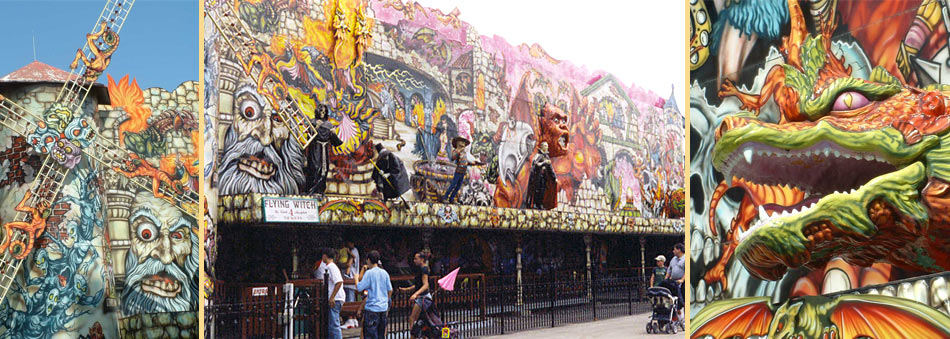 Over our many years of studying dark rides of all types and makes, we've always been interested in learning as much as possible about the designers and builders as about the rides themselves - what their backgrounds were, how they came to be in such a business and what influenced their sense of design. Over time, we saw certain patterns emerge. One of them is rooted in our observations of the Flying Witch ride that operates at Playland Park in Rye, NY. This ride, extensively augmented and originally named Witches Mill, is one of a number of such rides built by F.lli Pinfari S.r.l. in Suzzarra, Italy. Other known examples in North America and Canada were Witch Mill at Rocky Point Park in Warwick, RI, 1971-1973 and Le Moulin de la Sorcière at La Ronde, Montréal, Canada, 1969-2005. Pinfari, known primarily for its line of steel roller coasters, was established in 1926 and ended operations in 2004, its brand and ride design products acquired in 2007 by Interpark S.r.l. of Modena, Italy.