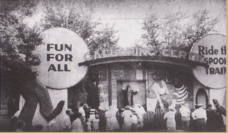 Another ride that has fond memories is the “Galloping Gertie” dark ride that took riders through darkened passages that featured both hilarious and scary props and stunts. The outside of the building featured big head people out of one’s dreams and an animated “Laffing Sal” animated woman mannequin that would constantly shake with loud almost shrieking laughter that would be heard up and down the midway. Roseland changed the name to “Giggling Gertie” and this PTC-built attraction would become a legend for many years to come. |