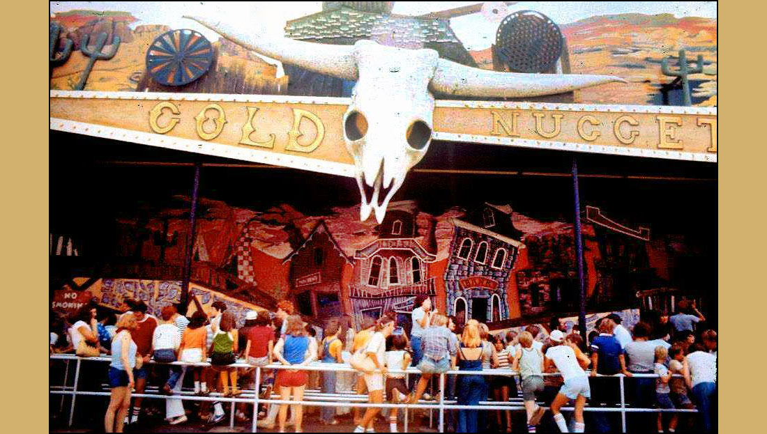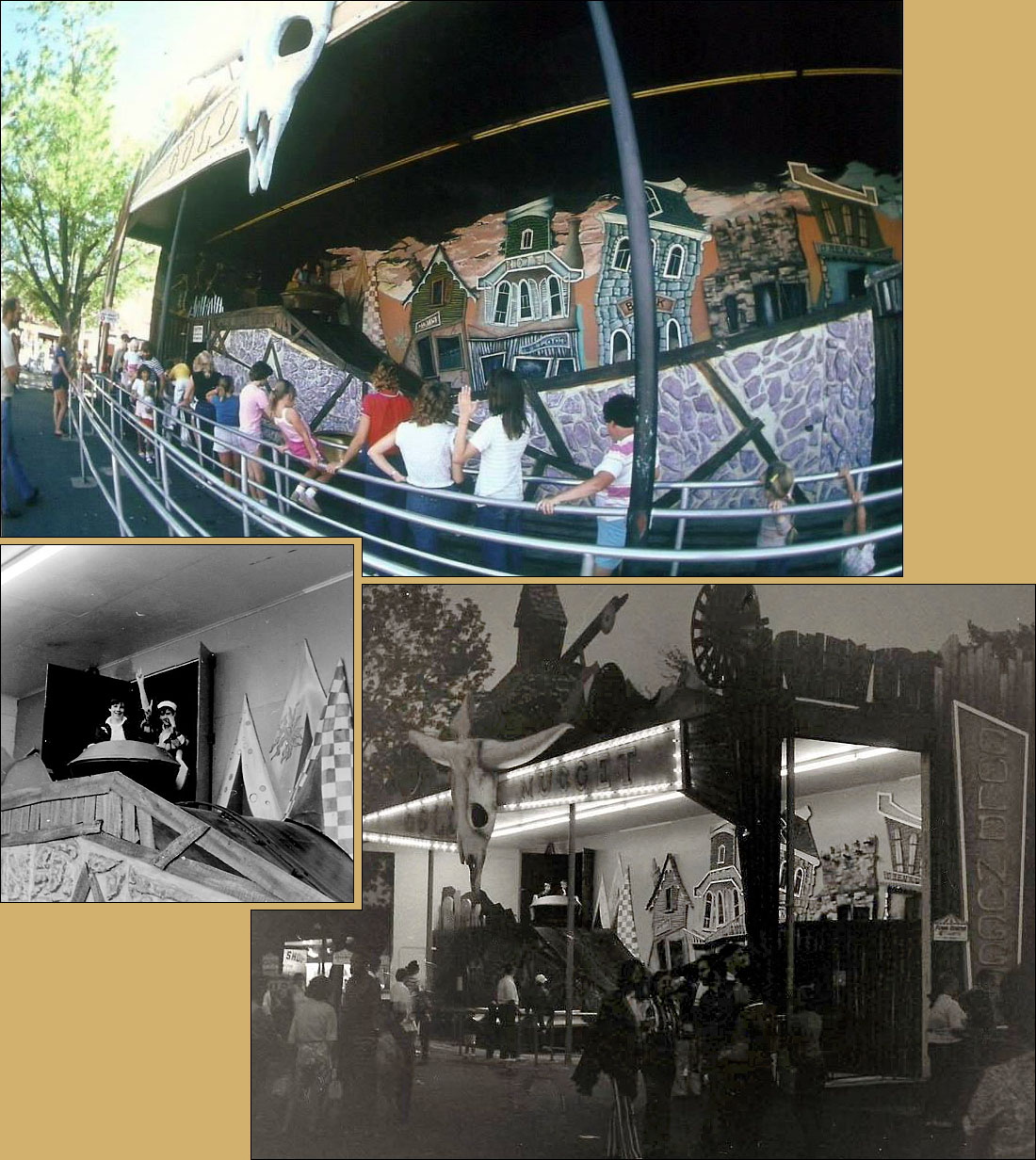 Tracy would bring his “Best of The Best” to Roseland's own custom version. Tracy was a master using UV black lighting, day glo paints and warping reality and space by using red/yellow striped painted rooms with strobe light effects. The outside facade had a large mechanical skull mounted with an exposed speed hill and roller coaster style drop, complete with warped and bent Western ghost town buildings and Indian tee-pees drawn in for good looks. |