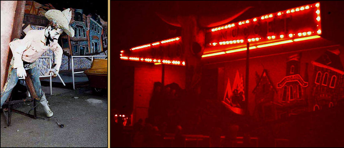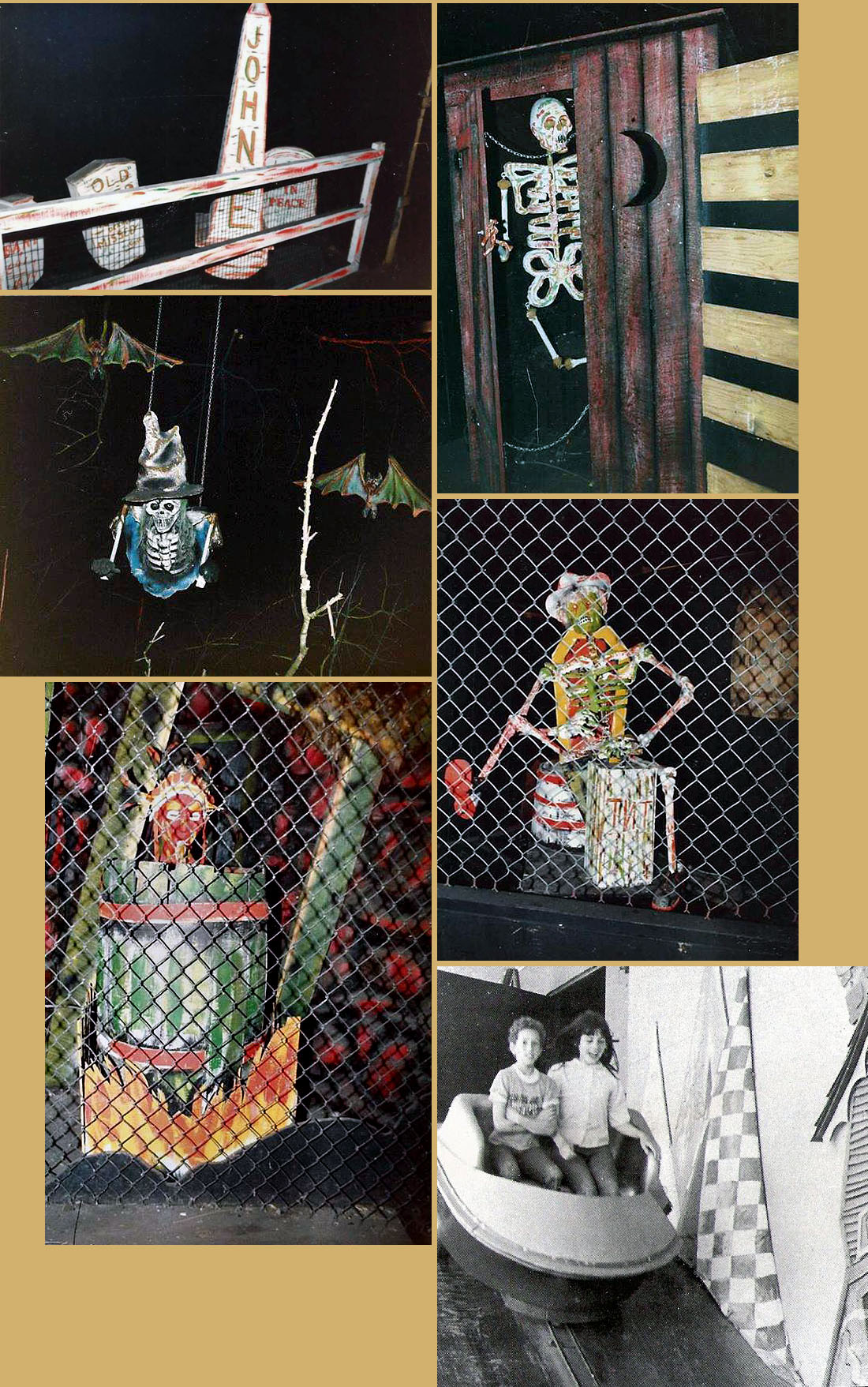 “Hush Puppies”. Cars entered the building on the left and went thru a spinning “hypnotic” barrel then encountered a graveyard scene, Tracy’s standard flying bats and ghouls, skeleton in an outhouse, skeleton ready to use a detonator to blow up riders, an Indian head popping up out of a barrel, large skull and water scene and of course, the trip outside the building then down the exposed hill. |