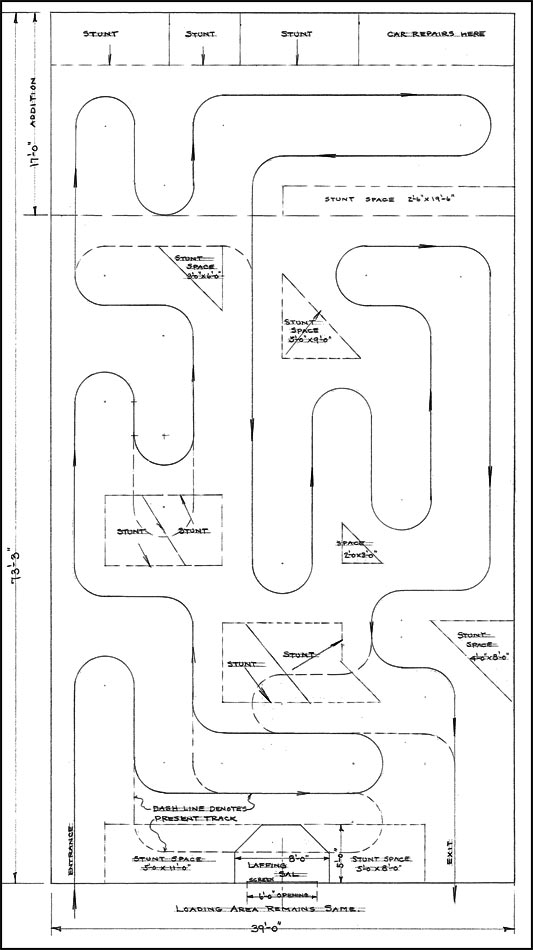 | The Idlewild Management Company also engaged the Philadelphia Toboggan Company to modify the track layout for the Rumpus and incorporate new stunts. Although PTC produced a set of plans for the ride – an odd request for a company that traditionally built fun houses, not dark rides – it is unknown whether those plans ever made it past the drawing board.xiii Idlewild did purchase $29.00 worth of new fun house stunts from the company in 1942.xiv |