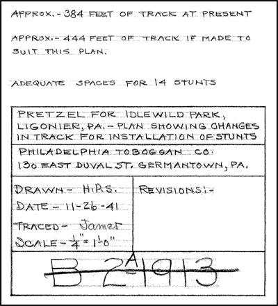 Philadelphia Toboggan Company. November 26, 1941. Note future PTC president Herbert P. Schmeck’s initials on the proposed track