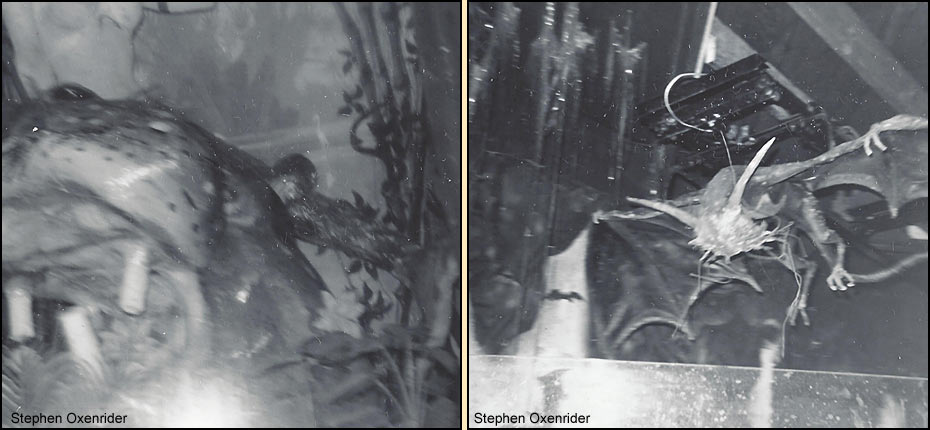 The left bend in the tunnel and appearance of light brought one final surprise. To the left was Tracy’s famous “Stanley and Livingstone” stunt. Henry Stanley, crouched on his knees, is prying open the jaws of a large crocodile. Peering out from inside the croc’s mouth is long-lost missionary Dr. David Livingston, bespectacled and with a pipe. Repeated every few seconds, Stanley inquires, “Doctor Livingstone, I presume?” The boats then proceeded to the lift hill and splashdown as before.