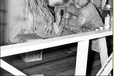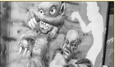 | The façade was now inhabited with Spadola’s bizarre interpretive renderings of the classic Universal movie monsters. Quite frankly, these were the classic monsters of an alternate universe, not the Universal creatures I grew up loving. Spadola’s Mummy had werewolf-like nails and wore suspenders. Frankenstein’s Monster is more reminiscent of a space alien with its claws and tentacles. The Creature From The Black Lagoon… he was presented multiple times in the loading area but most of his illustrations seemed to portray a real life person or an alien. |