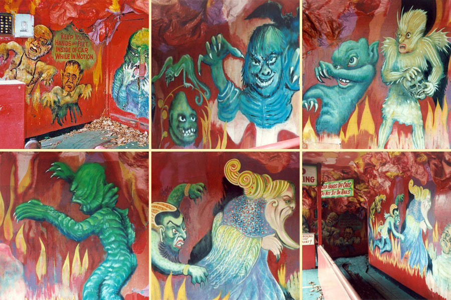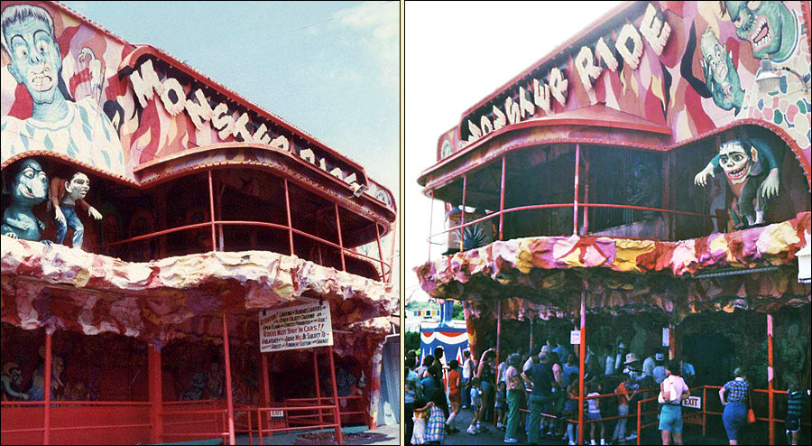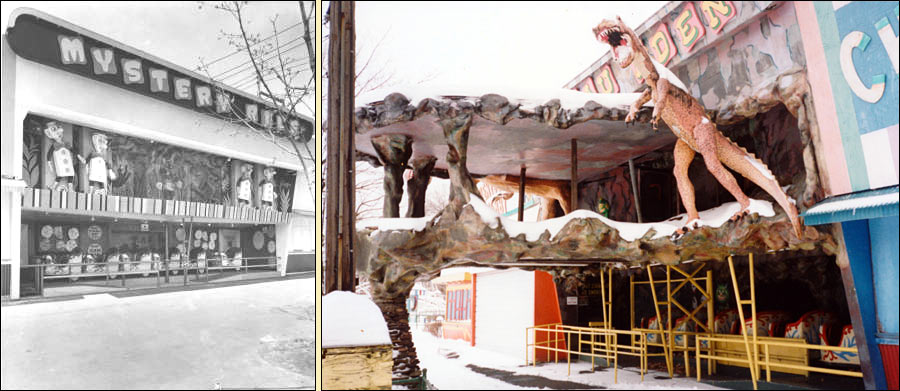 When I spoke to Dom Spadola in 1977, he told me that he wanted to convert the interior to a monster theme to match the façade, but park management opted not to. The kicker is that Lincoln Park’s sister park, Mountain Park, also converted its Mystery Ride façade to something new with Spadola at the creative helm — Dinosaur Den (both rides shown above). Mountain Park’s Mystery Ride was almost identical to Lincoln Park’s rendition; It also was created by Leis and Spadola and both rides used identical rolling stock. You can learn more about the Mountain Park rendition here