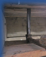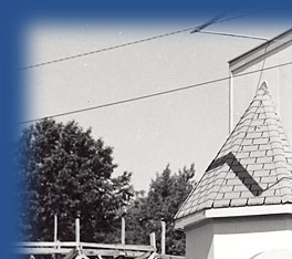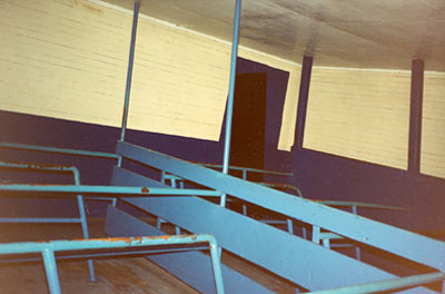 Going back into the darkened hallways you would feel your way along to a strange lighted slanted room with railings. The floors and ceilings were slanted. This room was divided into 2 areas, so more people could go through. |