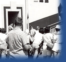 You would then pass through a turnstile, turn left over a little wooden bridge and enter a room where earlier there was a wind tunnel which was later replaced with slowly revolving striped canvas bumpers, just over waist high and about 2 feet across. There was never a problem getting through these as they would stop as you squeezed through them to the next room, where it looked like wooden crates were stored, floor to the ceiling on the left side. |