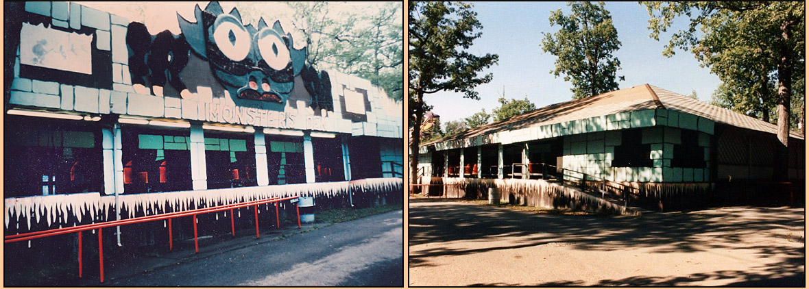 | The ride housed a facade that featured a "B-movie" style of an alien looking space monster, with bulging eyes, along with faux stone work made of corrugated cardboard and two painted murals on the upper facade, the left one featuring a witch riding a broom, the right a spiraling disc of doom. Fake flames cascaded near the queue line. Inside, riders were thrilled by a Frankenstein monster that rose up, a Gooney bird that squeaked, a falling tree, hanging string from the ceilings resembling cobwebs, and basic silly faces painted on many of the crash doors inside the ride. While not the scariest of dark rides ever built, it was charming and fit perfectly for what was Lakemont at the time. |