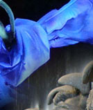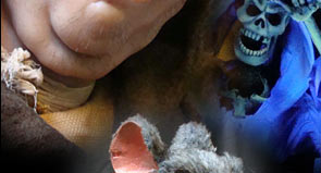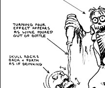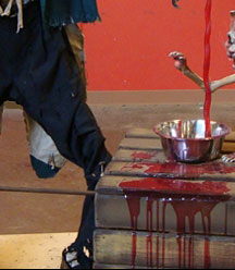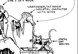 Rich Hill, Sally Corporation's lead designer for the Haunted Castle, described how he and his team approached the project: "It was my goal to translate the style of the designs done by R&R Creative as closely as possible for our production shop. This required breaking down every scene into its most basic form, and figuring out which characters and props would be custom sculptures and which would be cast from existing molds. Basic specification sheets were then created for each element, explaining any details that were crucial to the final look and show action of the ride. The specification sheets were then given to our Art Finish, Scenic Painting , Sculpting, Mold Making, Mechanical, Carpentry and Electronics Departments to use as a guide while creating the characters, props and effects. Then, I worked closely with Todd Gillrup, vice-president of production, and the department supervisors, giving art direction to assure the overall vision was carried out effect-